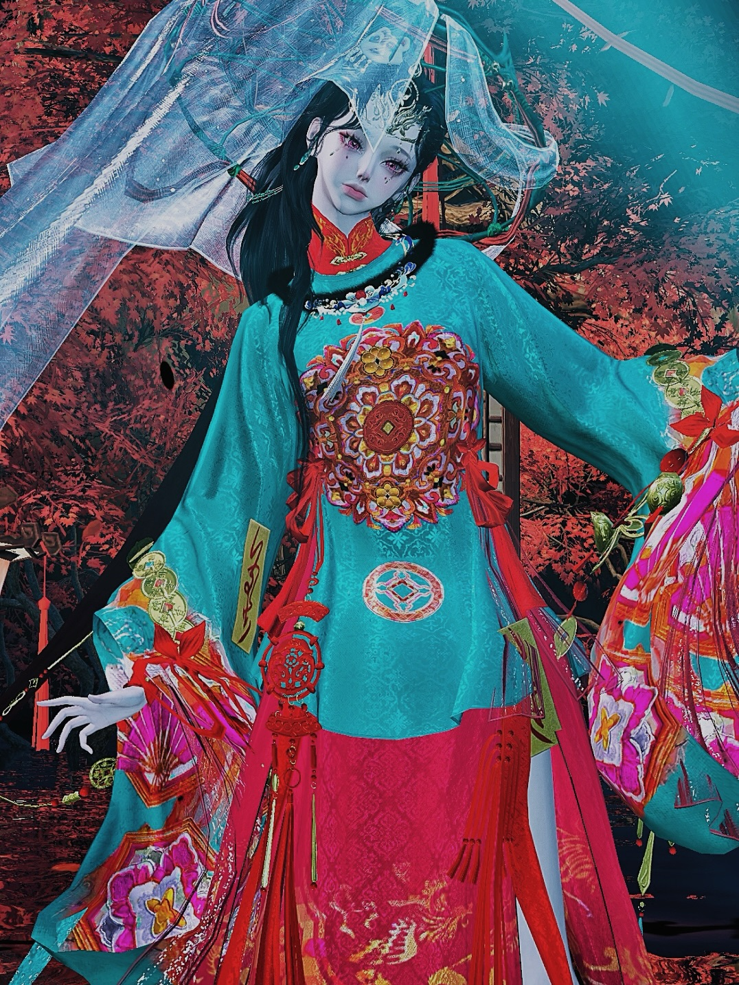 極致的撞色設計,將松石綠華服與紅葉背景強烈對比,營造出既華麗又神祕的氛圍。角色在那抹半透明輕紗下若隱若現,眼神中透著一股清冷與疏離,彷彿是一位擁有掌控時間與生死的強大氣場的古老神靈。