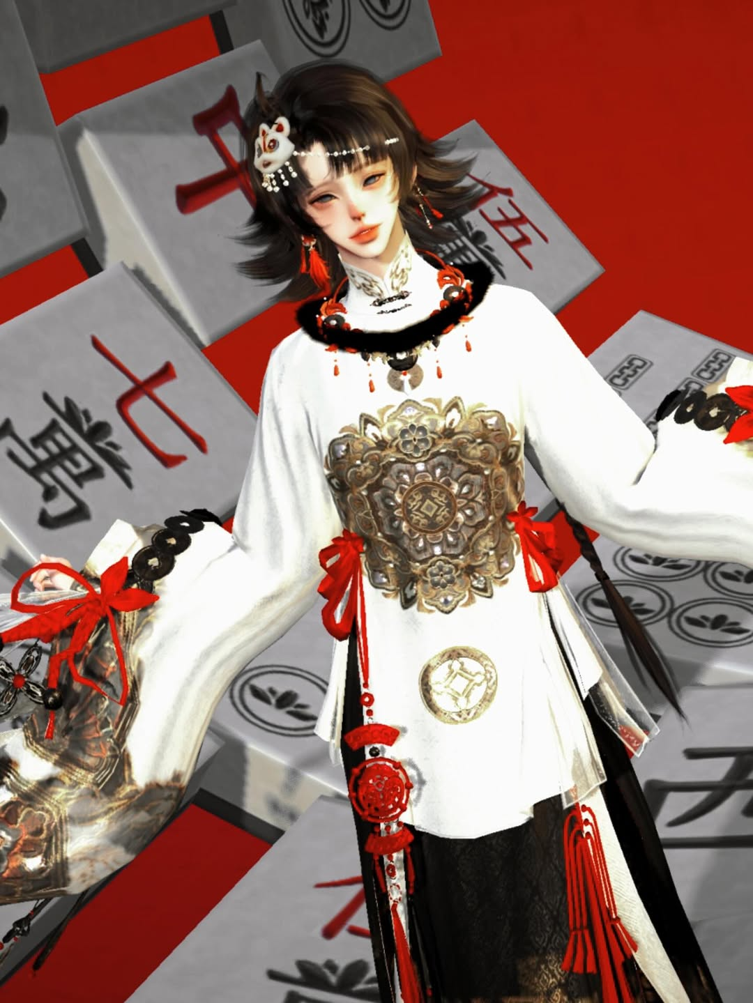 將巨大的麻將元素作為背景,與角色充滿新春氣息的紅、白、黑三色服飾完美融合。那種帶著一點小傲嬌與俏皮的表情,配合髮間迷你的獅頭裝飾,展現出一種獨有的酷颯感。