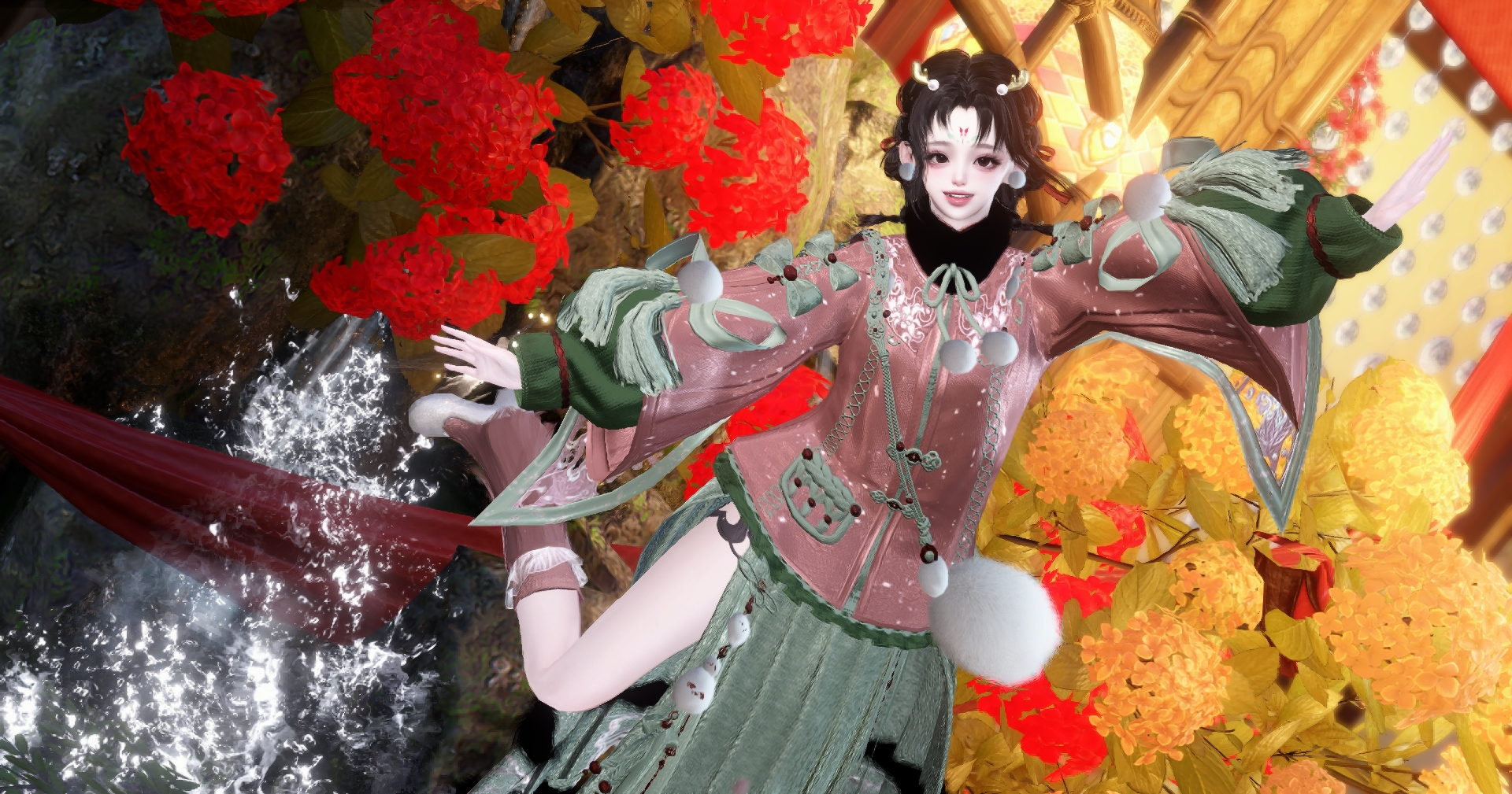 角色輕盈躍起的姿態,配合身後盛放的紅簇花卉,營造出極致的視覺張力。服飾上撞色的綠意與毛絨元素,完美襯托出少女神采奕奕的俏皮感。
