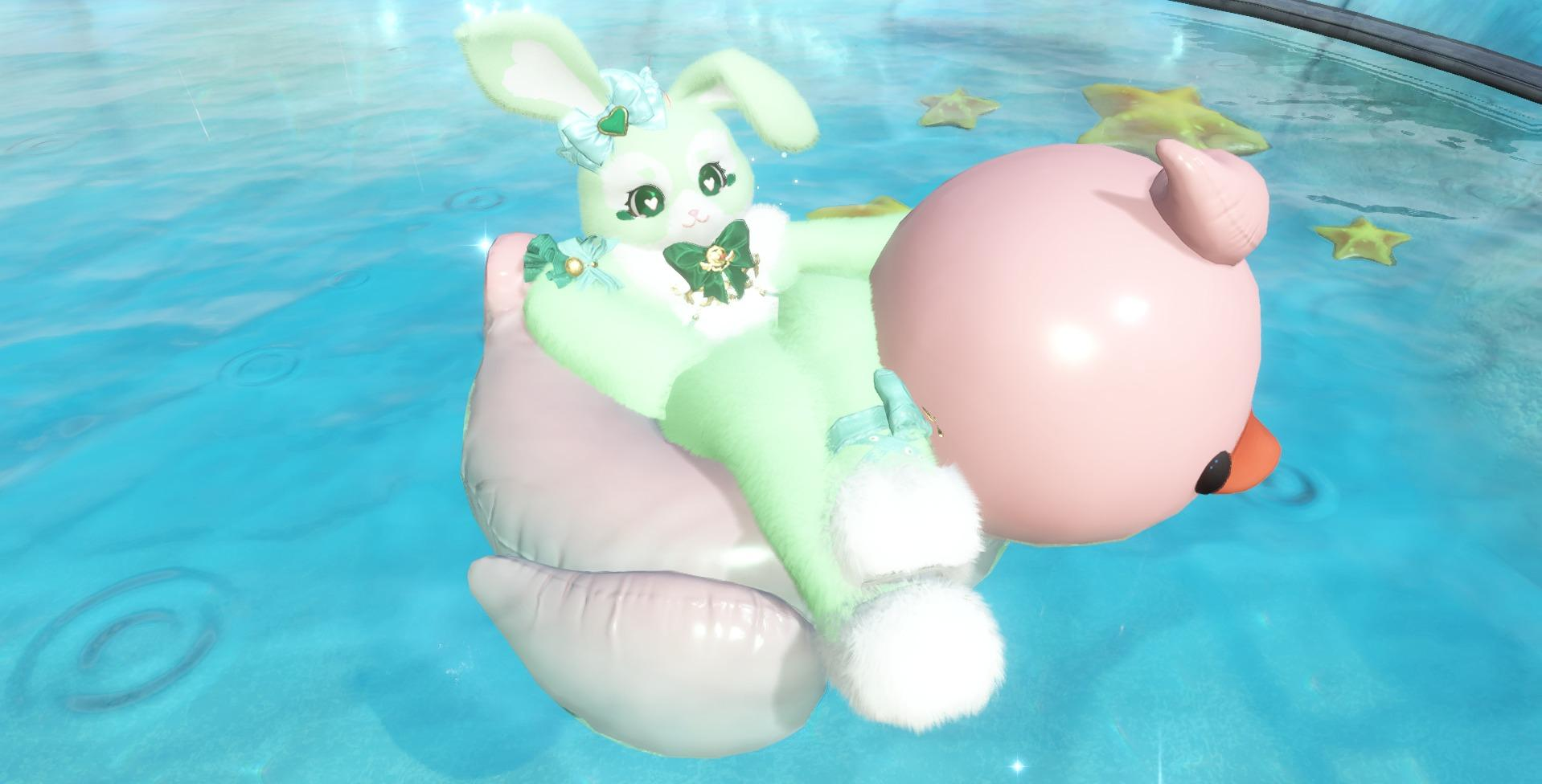 這絕對是畫面中最萌的風景!翠綠色的兔兔套裝與粉紅小鴨泳圈的搭配既大膽又可愛。在那清澈湛藍的水面上,角色這副怡然自得的姿態充滿了童話感,讓人看著就不自覺地跟著心情變好。