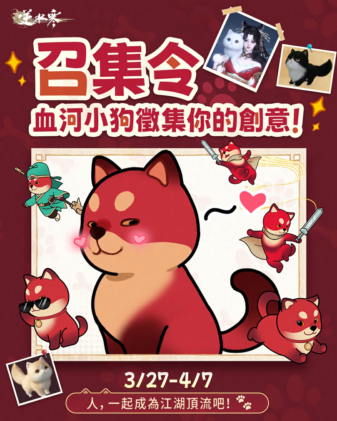 3 月 27 日至 4 月 7 日,不論是想揮灑創意繪畫二創作品、表情包🎨、拍下最帥的同框合照📸,或是繁育出獨一無二的萌寵後代🧬,只要投稿作品,就有機會把血河小狗精美週邊🎁與 980 紋玉時裝 帶回家!