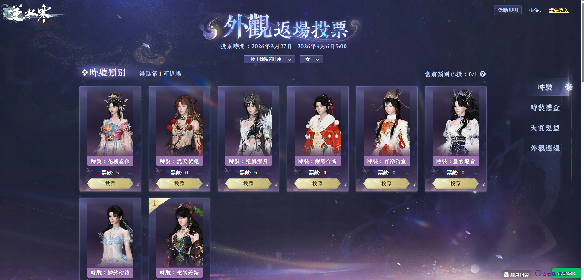 3月27日版本更新後到4月6日之間,時裝、時裝禮盒、天賞髮型和外觀周邊四大類別齊齊上陣,票數第一即可獲得返場機會。🗳️你一票我一票,喜歡哪套投哪套!