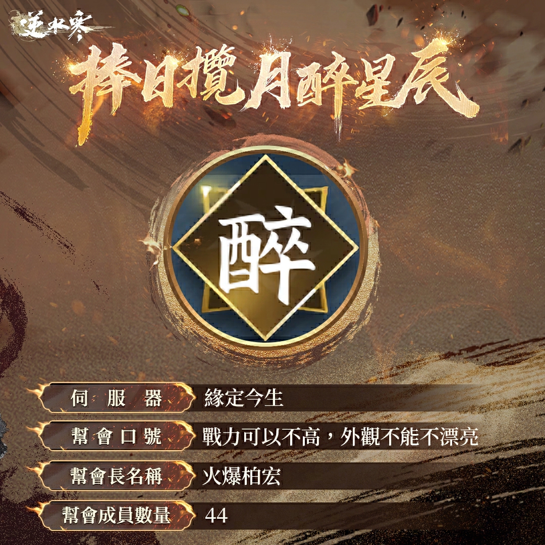 座落於【緣定今生】伺服器,由幫會長【火爆柏宏】所引領的【捧日攬月醉星辰】,目前已有 44 位同門在此共賞江湖風華!