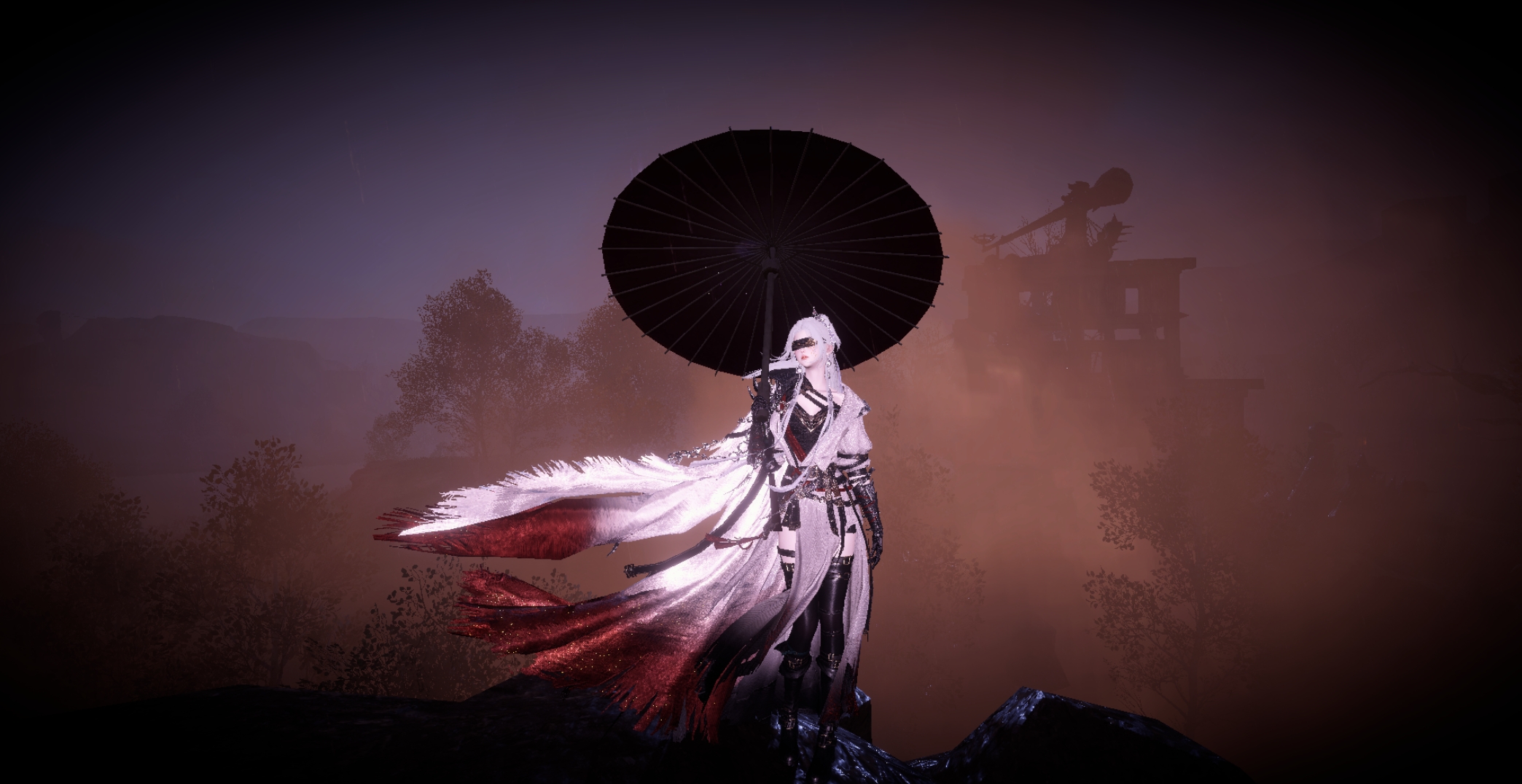 深沉的暮色與翻湧的紅霧交融,營造出一種末世戰場般的壯烈氣息。蒙眼角色的孤高身影與手中那把漆黑油紙傘相襯,紅白漸層的披風隨風狂亂飛舞,如同在烈火中綻放的彼岸花;整幅畫面充滿了故事張力,將角色的霸氣與神祕感推升到了頂點。