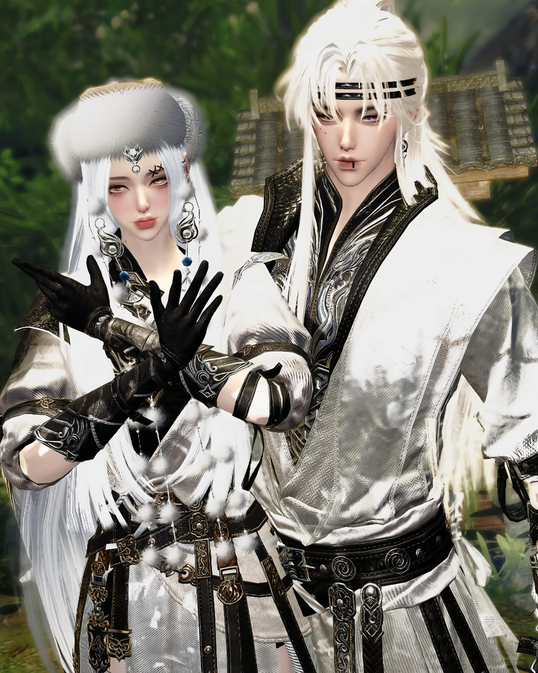 雙人角色均以銀白色系登場,宛如從雪山深處走出的神祕族裔。兩人神情慵懶卻帶著不容侵犯的貴氣,服裝上細膩的金屬飾品與皮革紋理,在日光下交織出豐富的層次感,完美詮釋了冷傲與狂放並存的高階視覺美學。