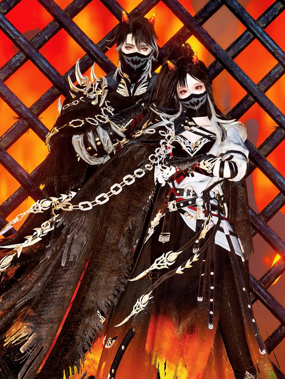 強烈的紅黑背景如同燃燒的煉獄,與角色身上漆黑的裝束形成極高的視覺反差。兩人戴著神祕的面具與眼罩,僅露出銳利且冷傲的眼神,充滿了不容挑戰的威嚴。金屬鎖鏈橫跨畫面,增添了幾分狂放不羈的野性。