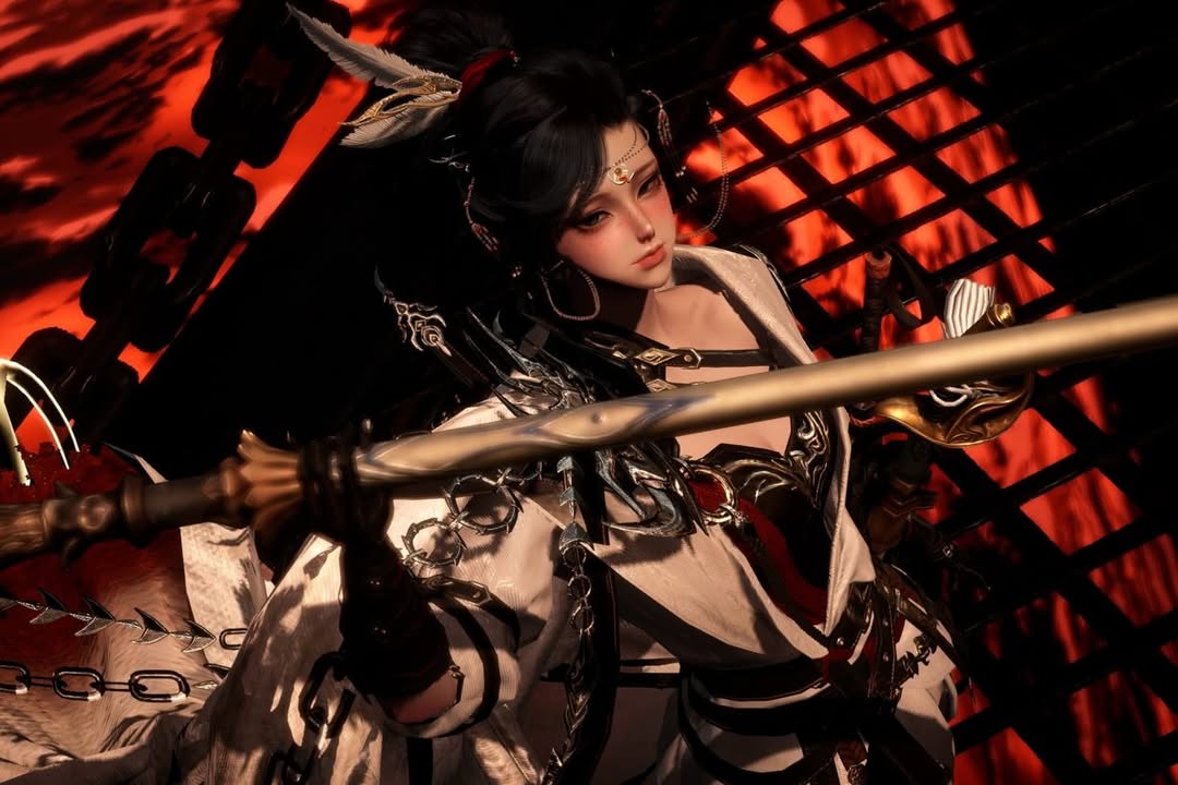 角色側身持槍的姿態英氣十足,精緻的妝容在火光映襯下更顯冷艷。黑白紅三色的服飾配色與飛揚的羽飾細節相得益彰,將那種不畏烈火、傲視戰場的狂野氛圍,演繹得淋漓盡致。