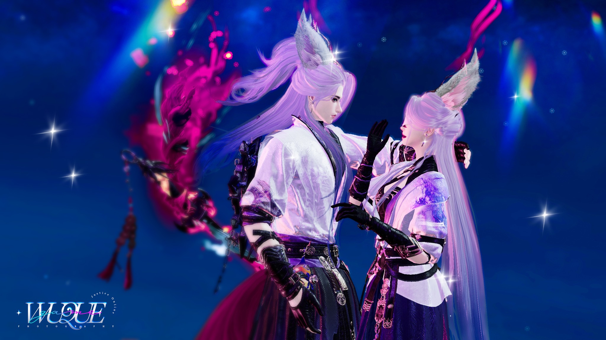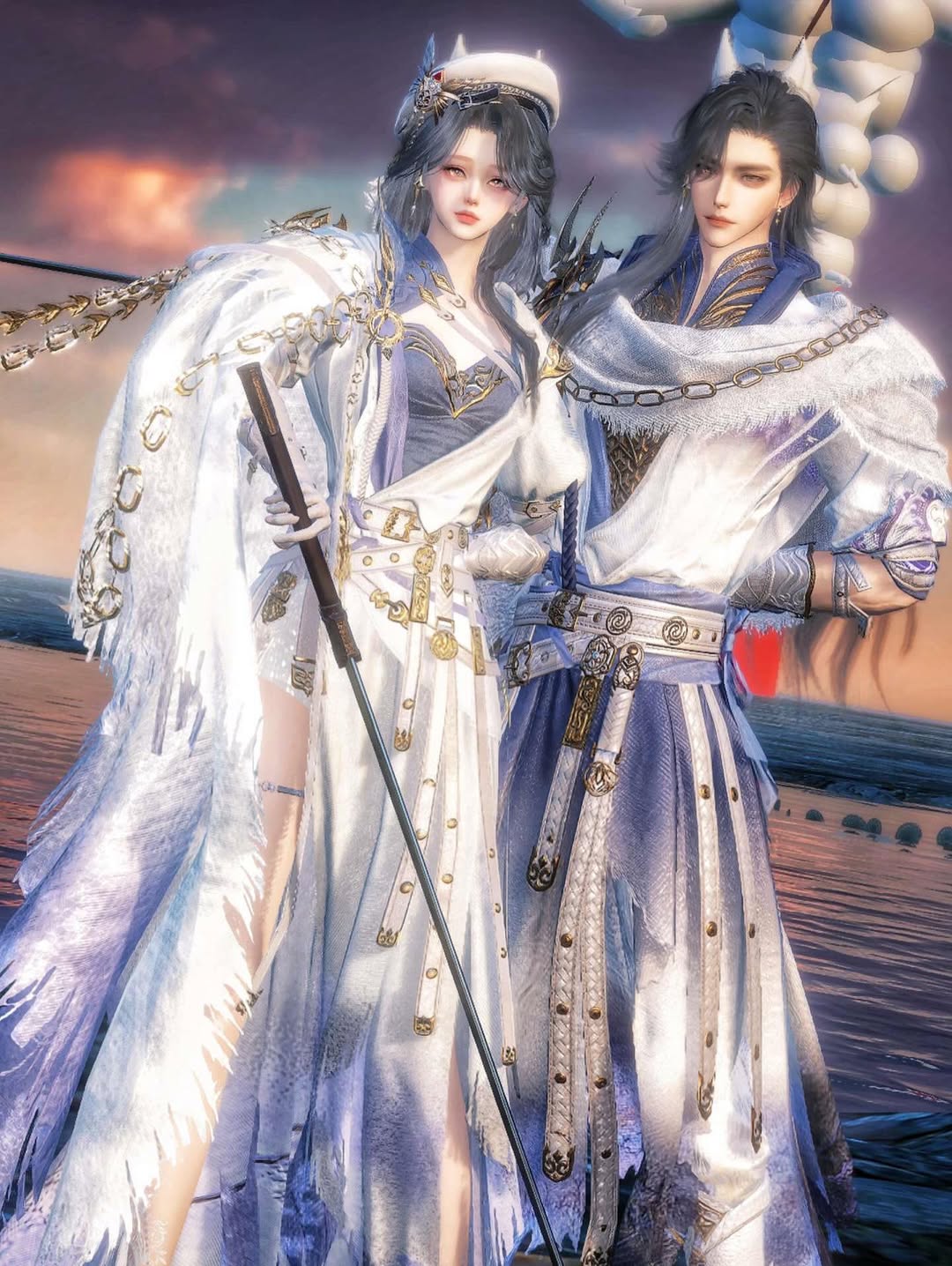 畫面中的兩人一剛一柔,身著銀白與淡藍相間的華麗服飾,在光影下閃耀著細緻的絲綢光澤。那種冷傲且超凡脫俗的氣質,配合精緻的飾品細節,彷彿一對隱居世外、主宰雲端的神仙眷侶。