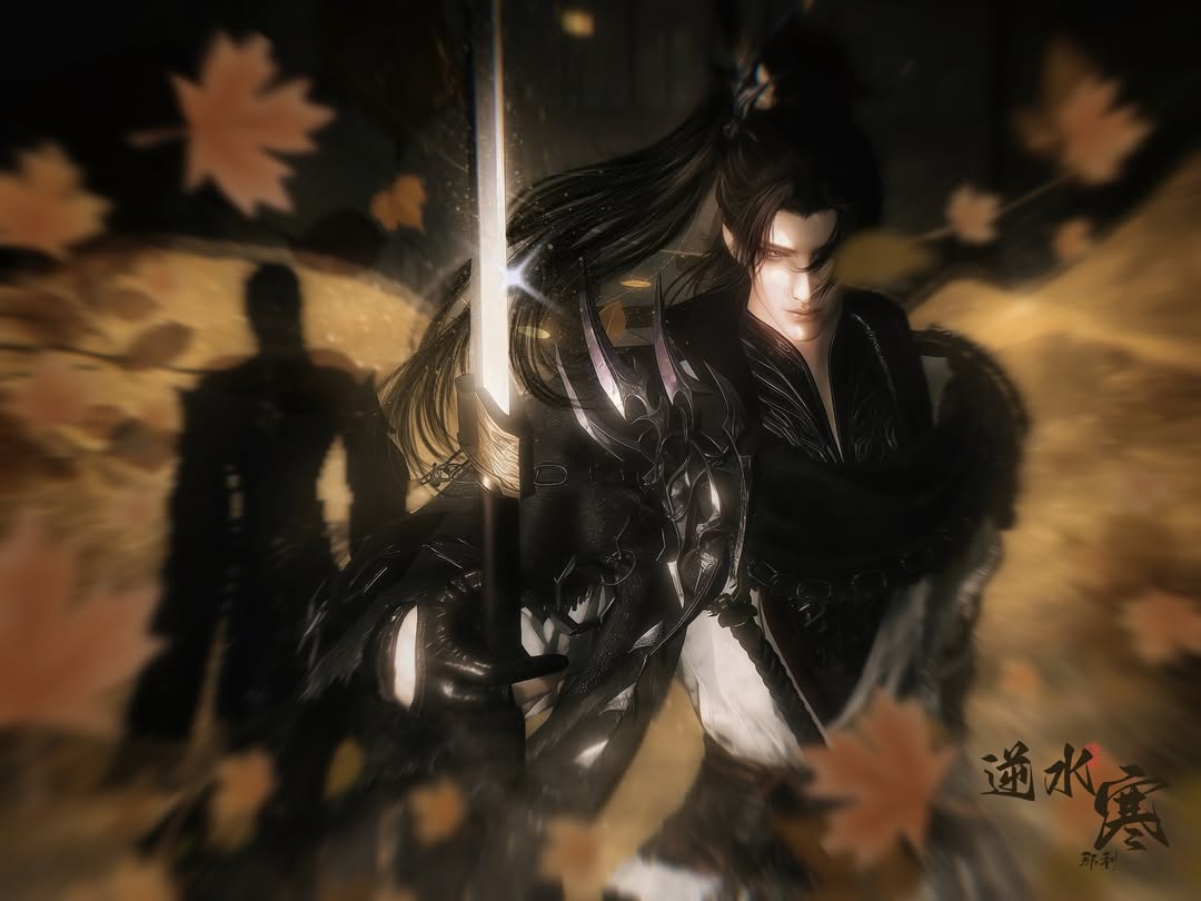 漫天飛舞的秋楓與深邃的暗影構成了極致的動靜美學。角色那雙冷冽的眼眸在長髮與楓葉間若隱若現,手中長劍散發出的那一抹寒光,瞬間點亮了整幅畫面的肅殺之氣。