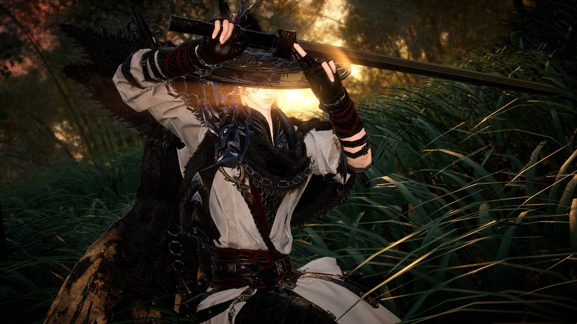 夕陽餘暉穿透密林,灑落一地金光,與角色身上冷色調的裝束形成強烈視覺衝突。斗笠陰影下那雙若隱若現、冷峻且深邃的眼眸,配上隨意卻充滿壓迫感的持刀姿態,將浪客武俠孤傲美感,發揮得淋漓盡致。