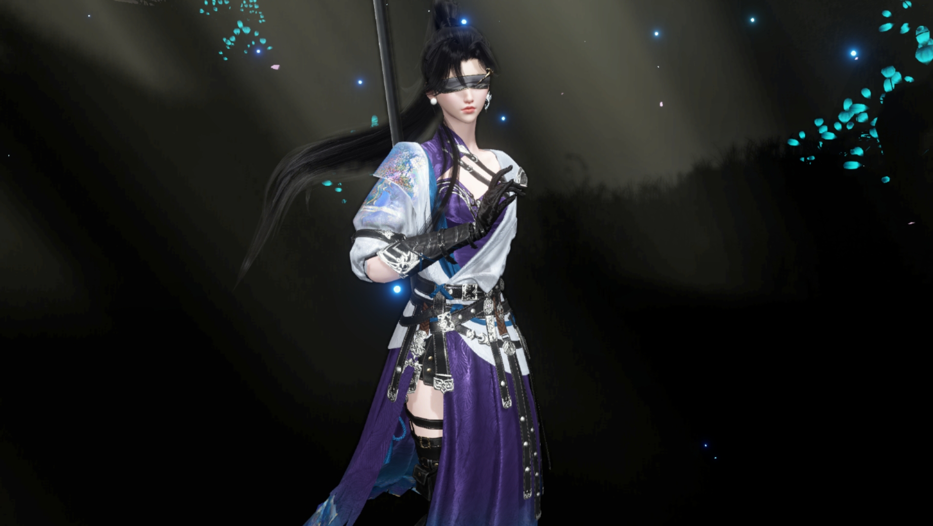 深邃的暗夜中,點點螢藍幽光如同暗夜精靈般飛舞,將角色襯托得更加超凡脫俗。即便雙眼被眼罩遮蓋,那股由內而外散發出的冷傲氣質依舊無法掩蓋。角色身上華麗的紫色裙裝與精緻的皮革配飾相得益彰。