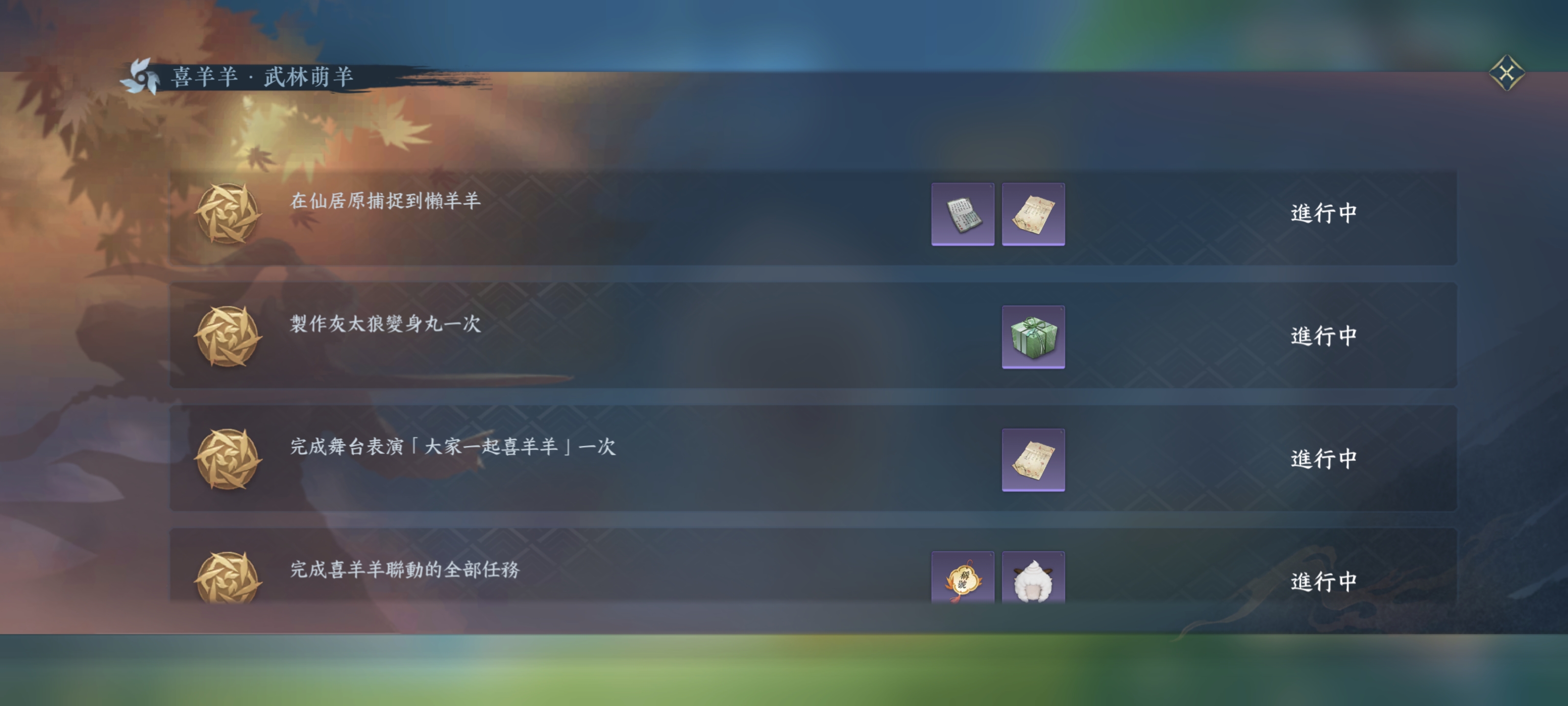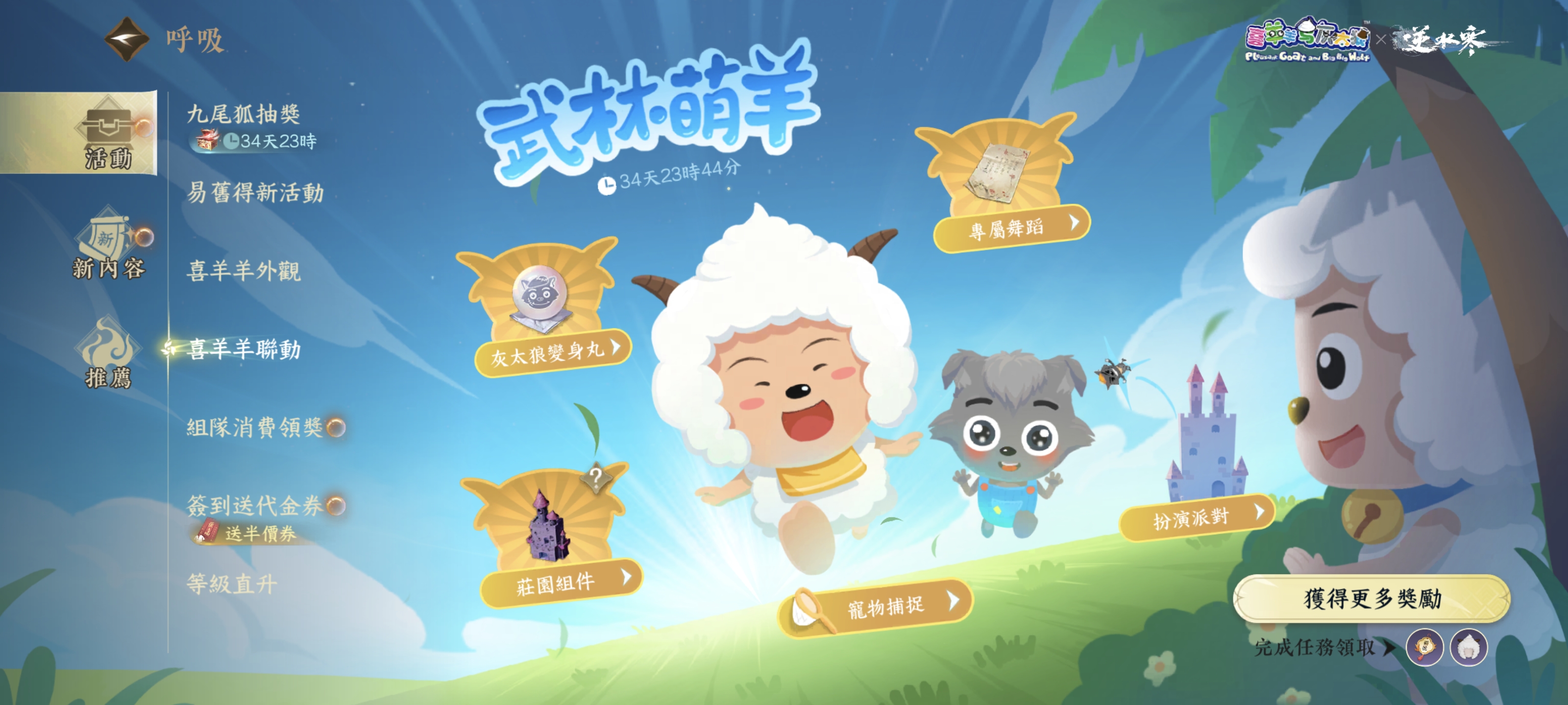 抓完羊別急著走,全新活動「武林萌羊」已經備好大禮等你領。完成「武林萌羊」聯動任務可以免費獲得【頭飾:咩咩·懶羊羊】和稱號【別看我只是一隻羊】、身份新增的超萌羊羊舞舞蹈特效【大家一起喜羊羊】和工藝配方【灰太狼變身丸配方】,以及包含喜羊羊、美羊羊、懶羊羊、灰太狼、紅太狼、小灰灰六個角色在內的【喜羊羊聯動語音包】等豐富獎勵。看來一場青青草原×大宋江湖的舞林對決就要在所難免啦!