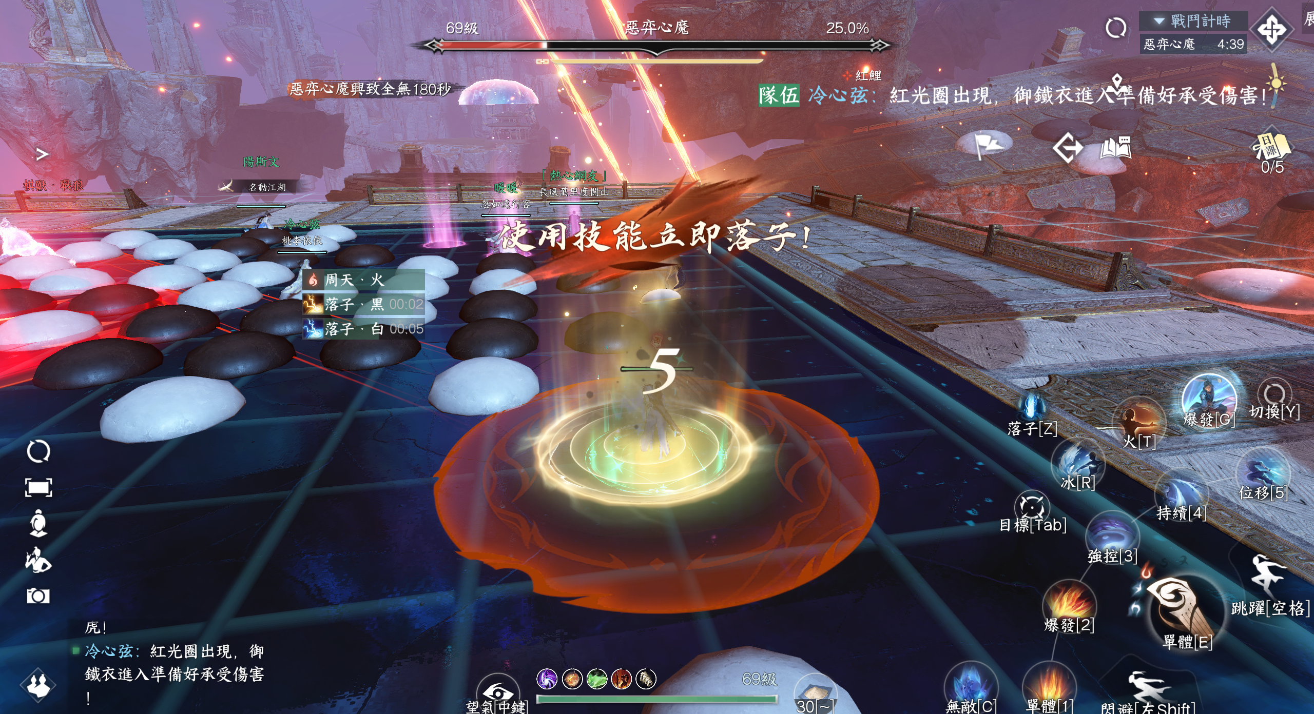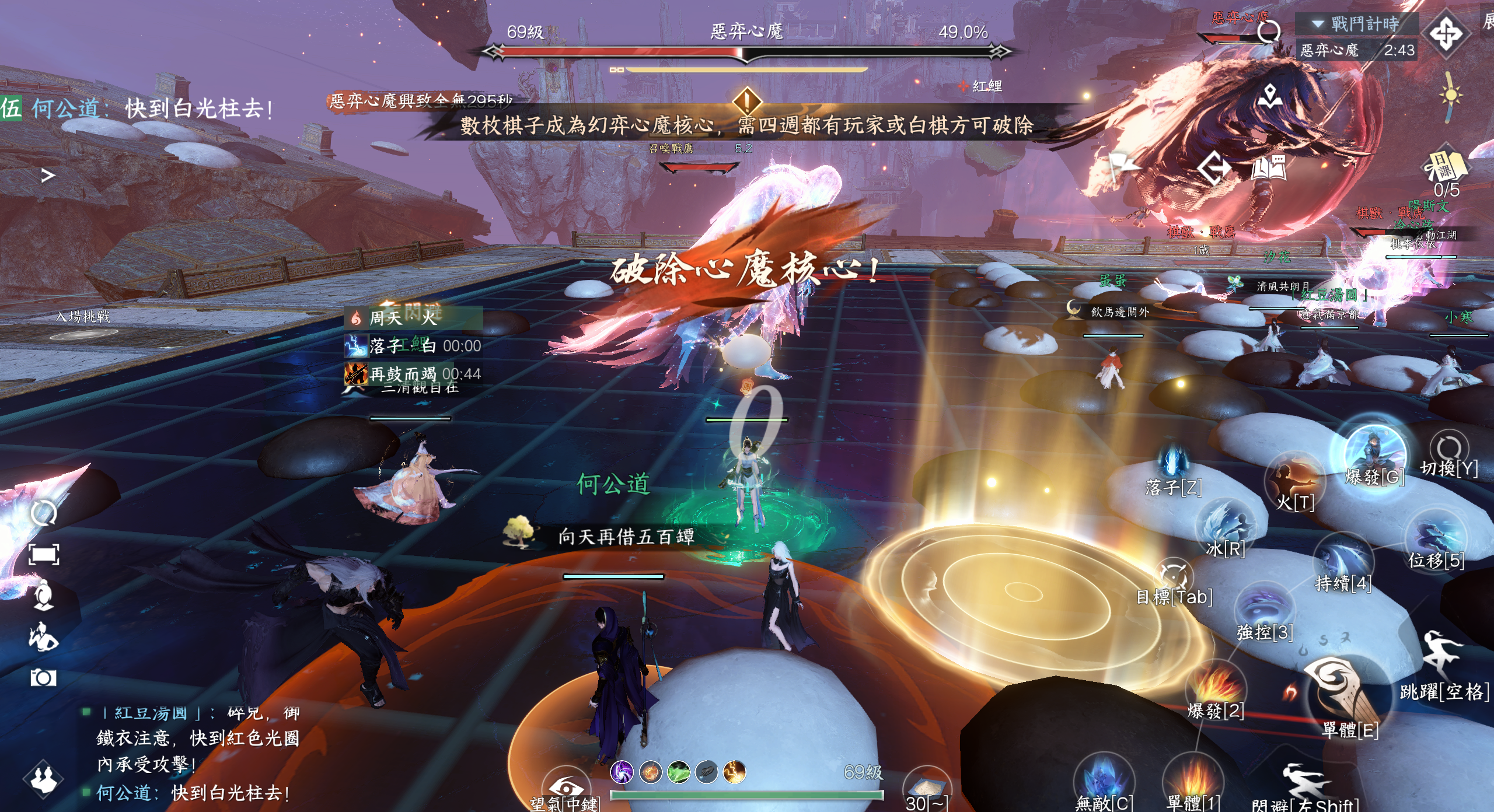 應對方法:地圖上出現紫色光圈時,第一時間前往紫色光圈的位置站位,每個核心黑棋需要4位玩家站位。所有紫圈處理完畢後,幻弈心魔消失。