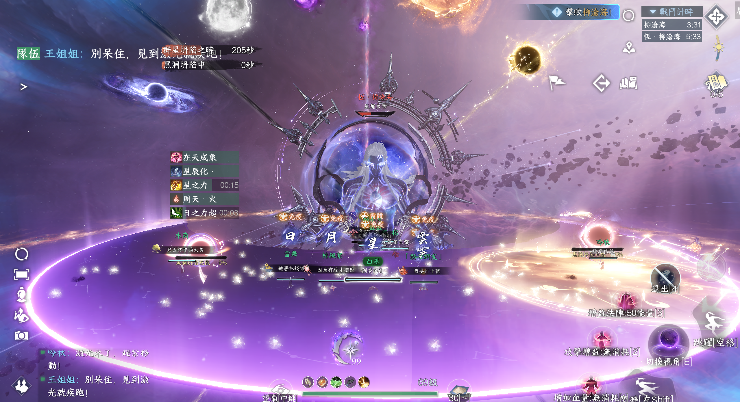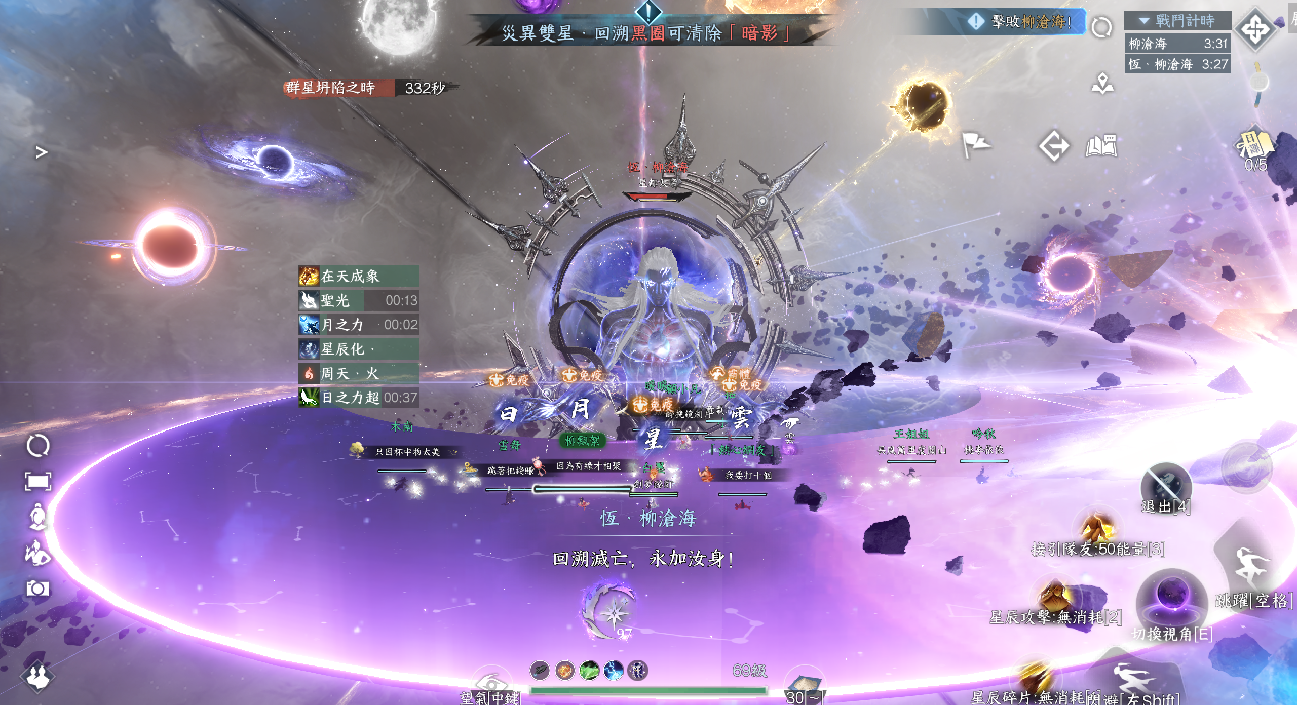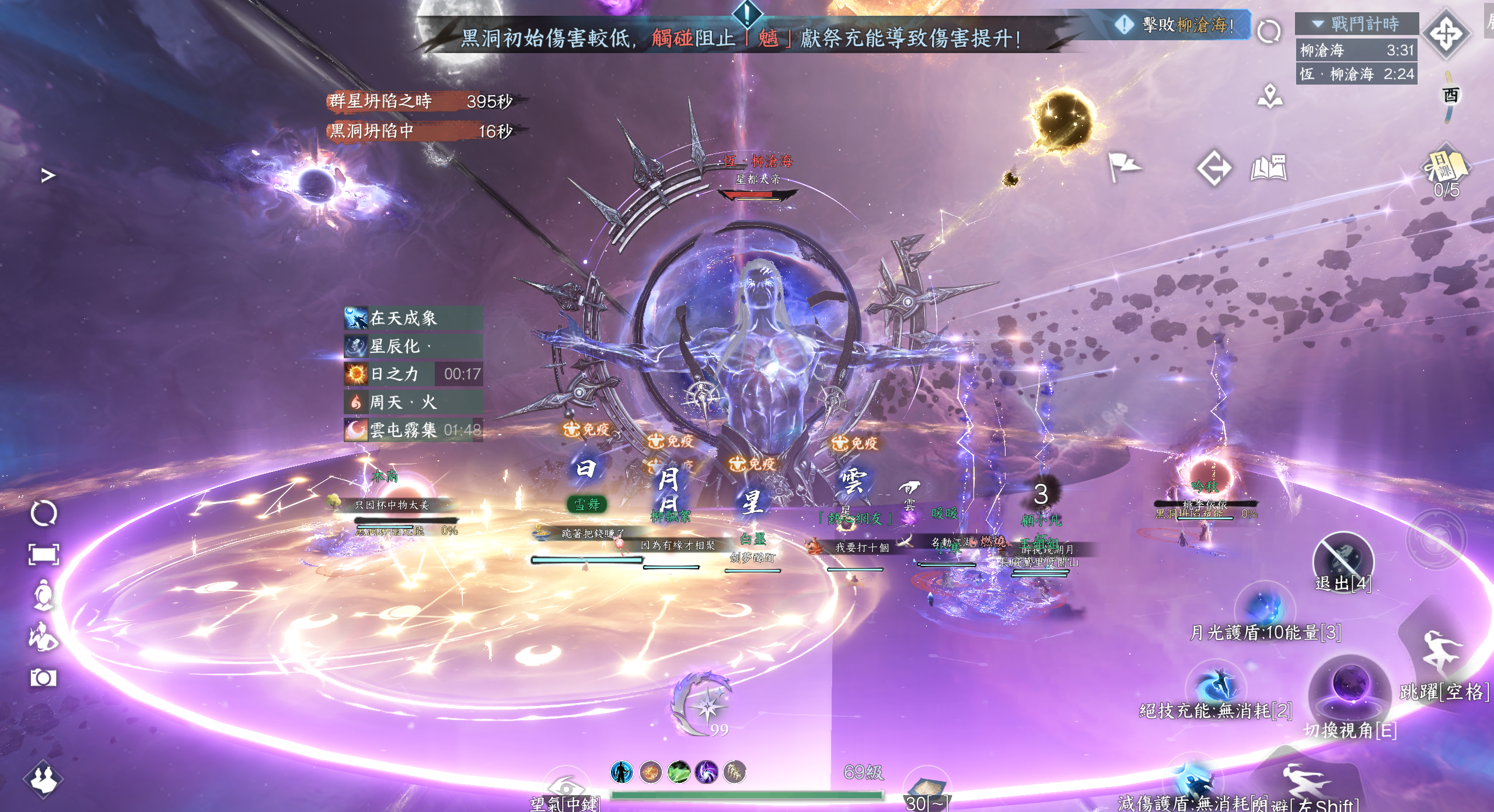 技能3:召喚月光護盾,所有玩家躲在護盾下抵擋萬物寂滅階段(70%、40%、10%血量時釋放)的全螢幕傷害。