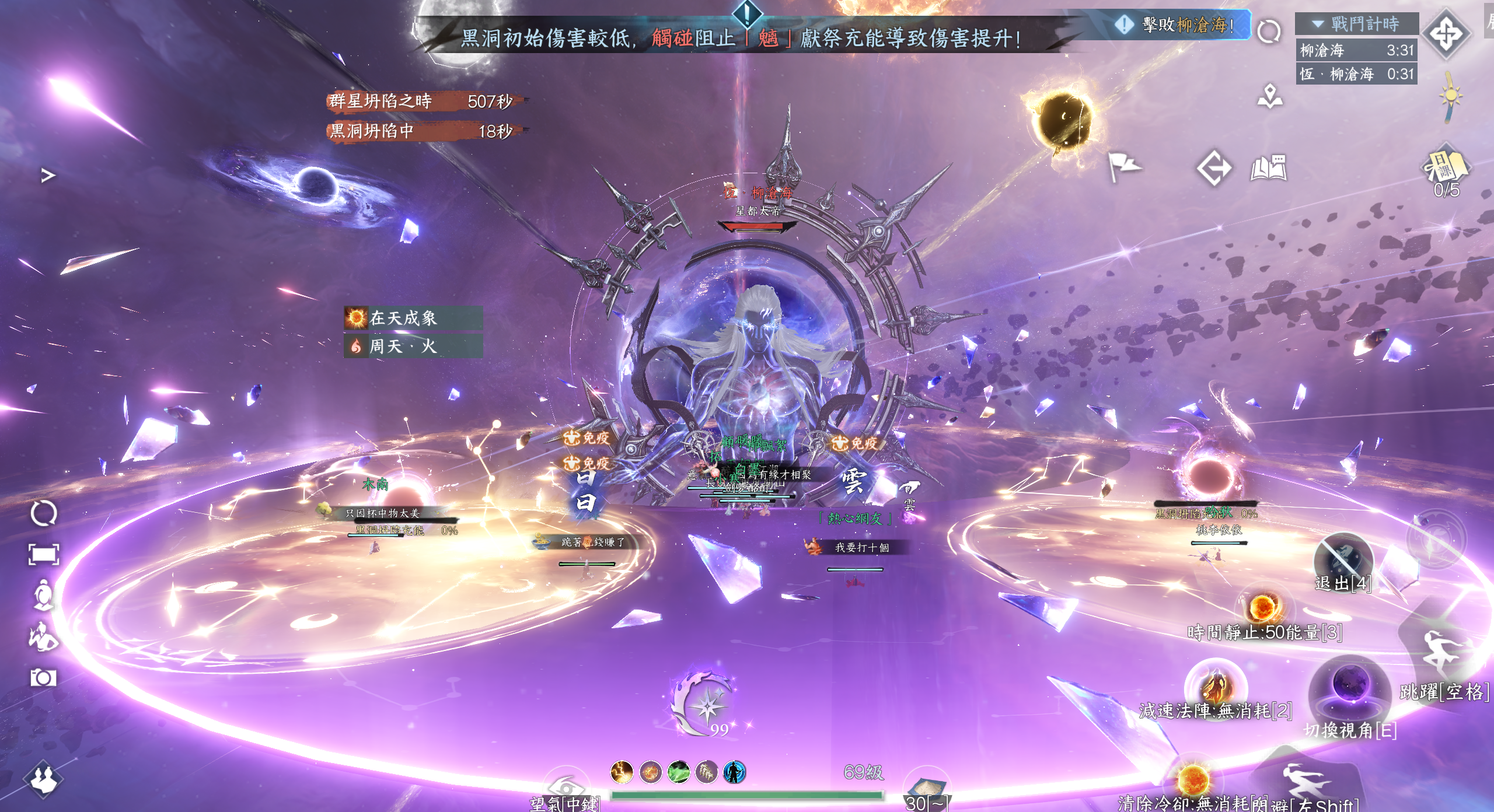 使用技能2的減速陣法,配合技能3的時間靜止效果,處理黑洞的魑魅魍魎;使用技能1重置其他玩家的技能冷卻時間,以提高輸出。