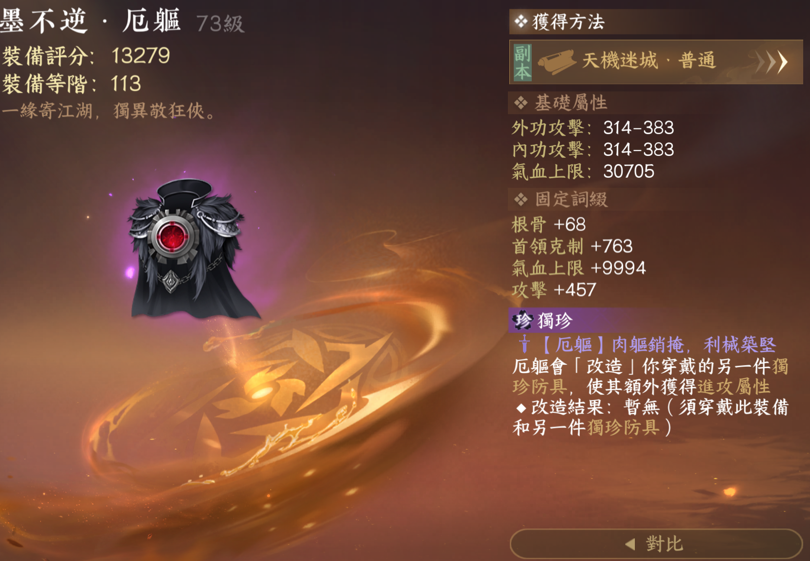 擊敗墨不逆後,您將有機會收穫兩件全新的獨珍裝備【墨不逆·厄軀】和【墨不逆·斷妄寒鎖】。