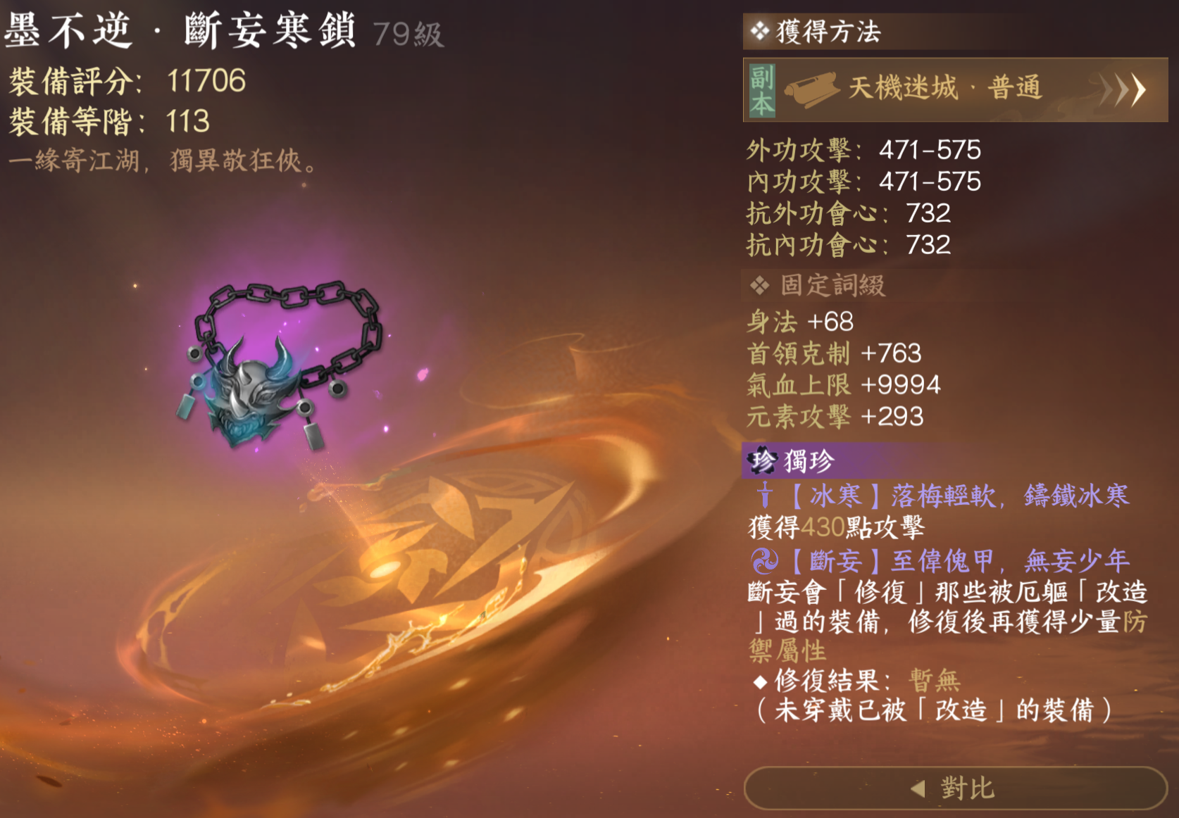 另一件與墨不逆邪惡機關術格格不入的獨珍【墨不逆·斷妄寒鎖】,似乎能修復上述被厄軀惡念侵蝕的裝備,獲得額外的防禦屬性。