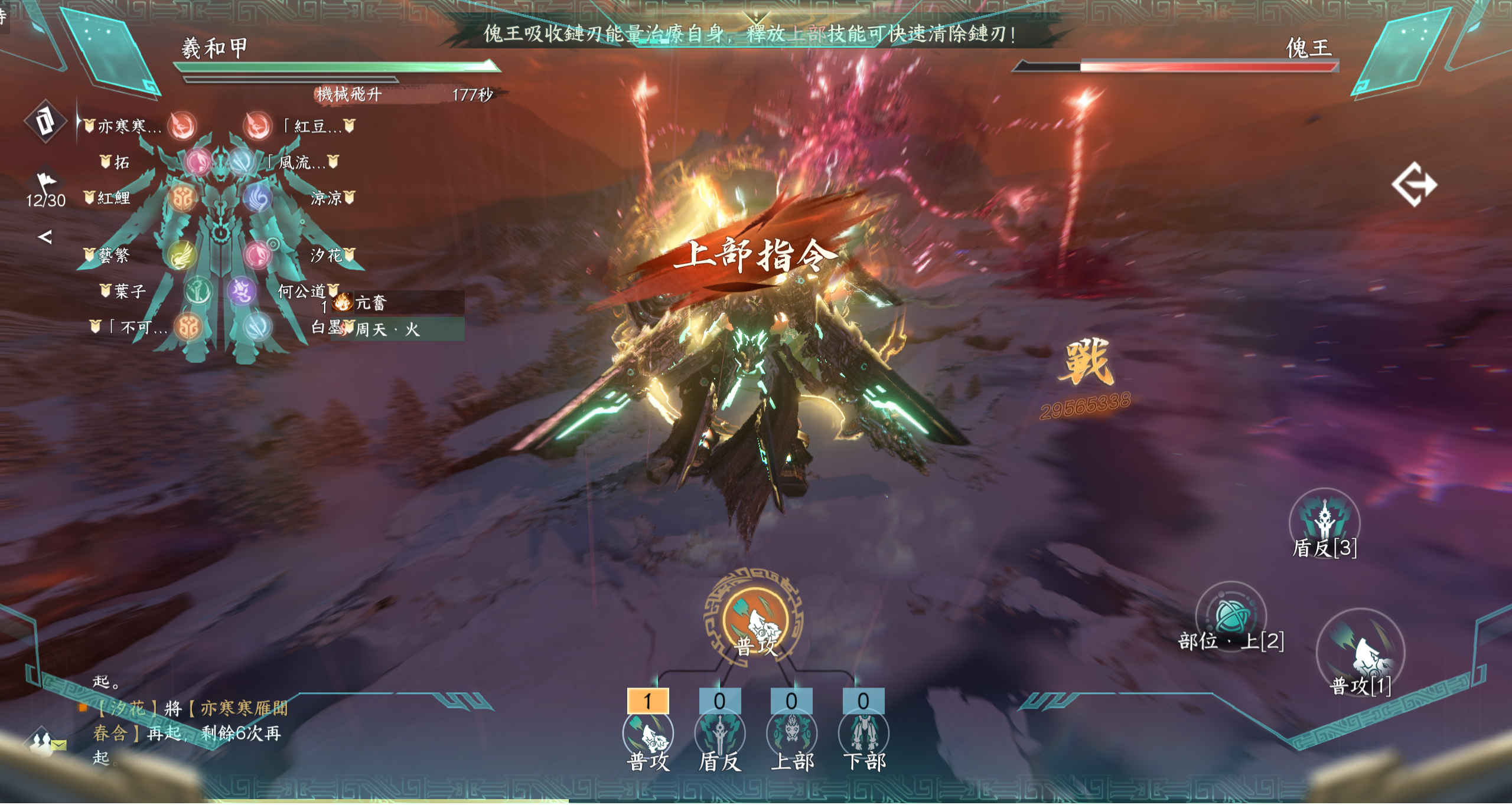指令二:部位指令。可以在組隊訊息中看到上、下部的人員分配,首領將會提示上部或下部指令,除對應部位的玩家點擊部位指令技能,其餘玩家無需進行任何操作。