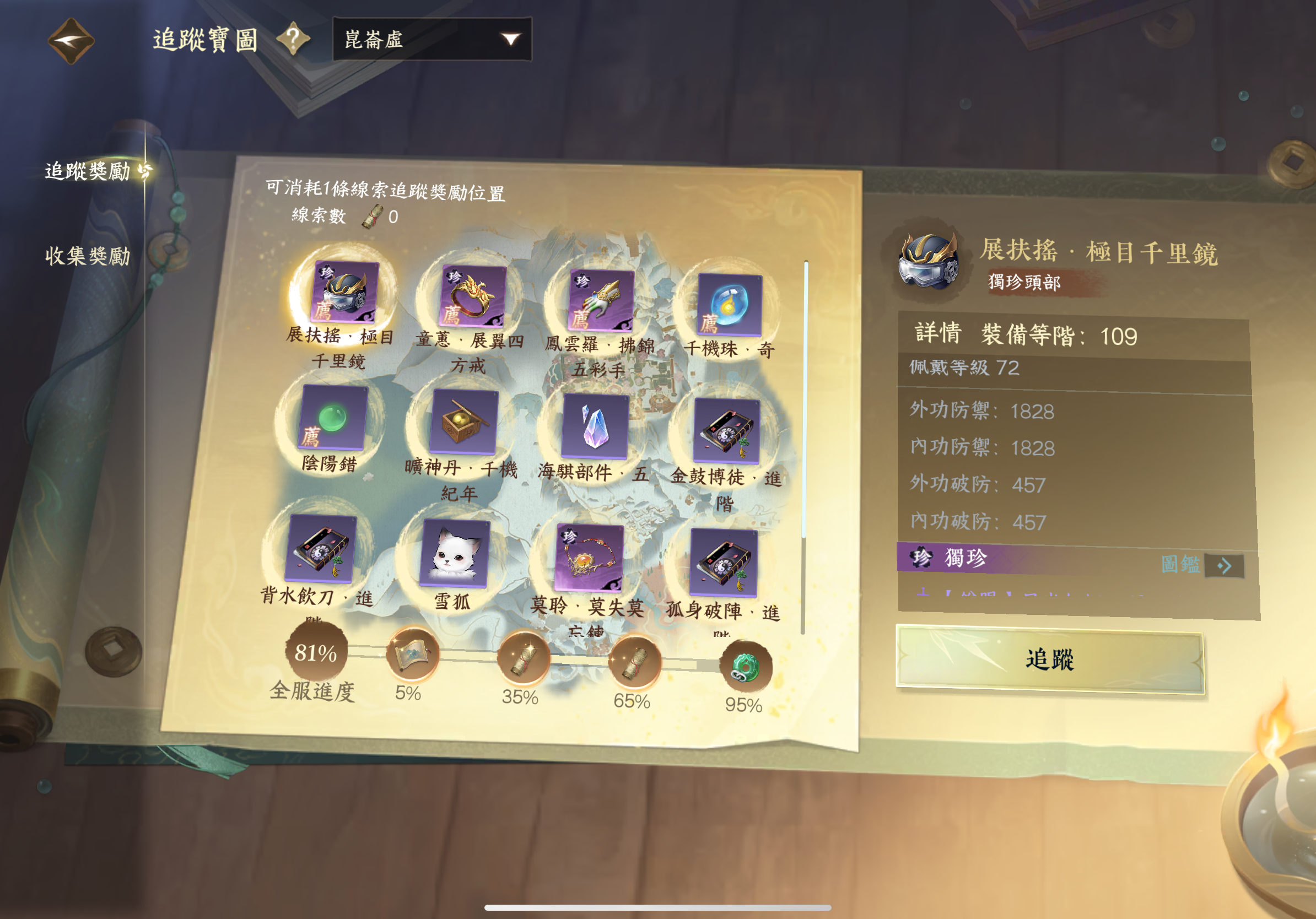 獨珍頭部【展扶搖·極目千里鏡】、獨珍戒指【童蕙·展翼四方戒】、獨珍手套【鳳雲羅·拂錦五彩手】、獨珍項鍊【莫聆·莫失莫忘鍊】、寵物【雪狐】、坐騎【晚墨海騏】等獎勵。