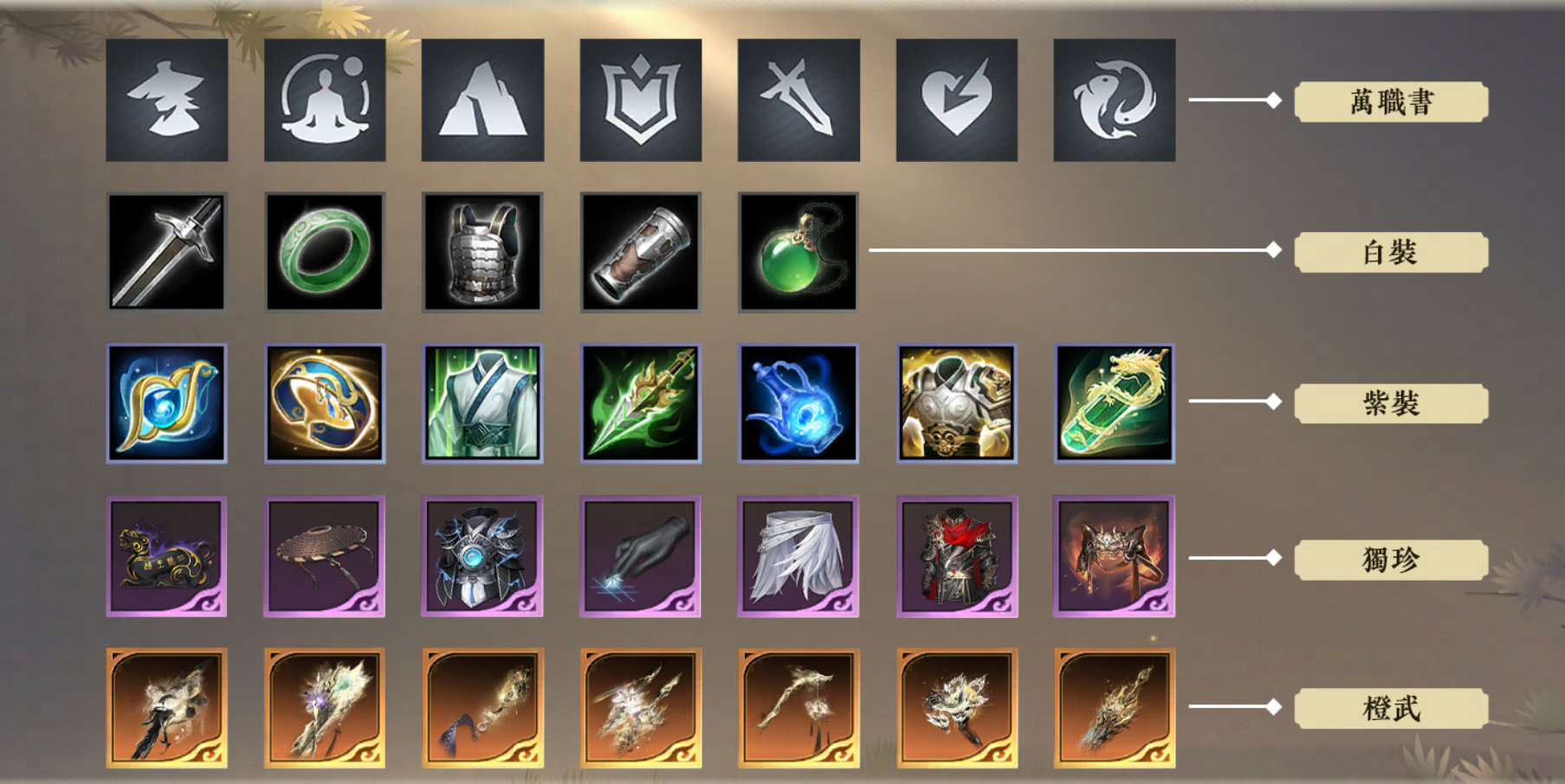 裝備擁有進攻、防禦、特殊三個屬性,品質分為白裝、紫裝、獨珍、橙武,品質依次升高,對應屬性也越強。